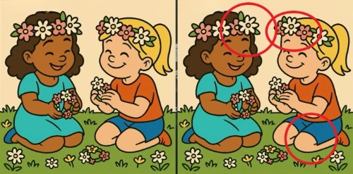 So, are you ready for your next challenge? Take a good look at these two pictures of two girls making tiaras from flowers. They might seem identical at first, but there are 3 tiny differences that are cleverly hidden in the image. Do you think you can find them all in just 17 seconds? Try this puzzle and see how sharp your eyes really are!