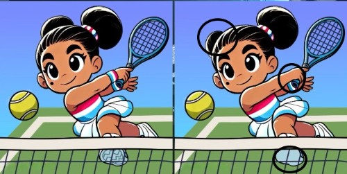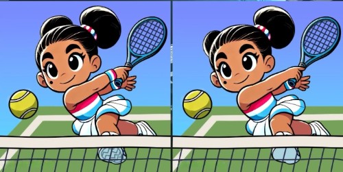 This spot-the-difference puzzle features two nearly identical images of a young girl playing tennis. Your task is to find three subtle differences between them.