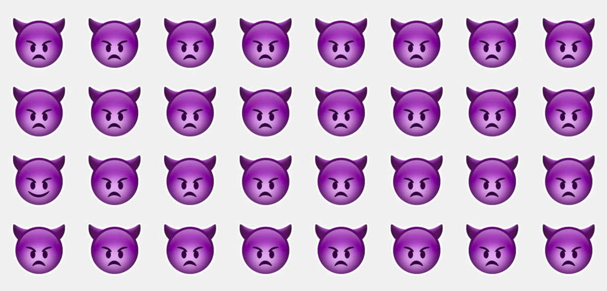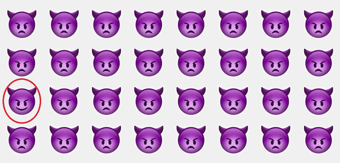 The odd emoji can be spotted in the first column and third row. The emoji looks different than others as it is smiling while others have angry face.