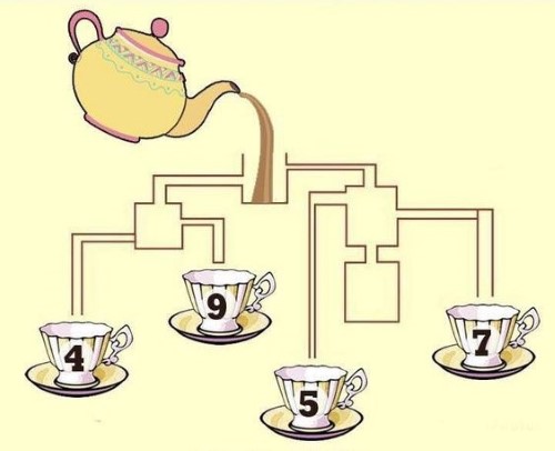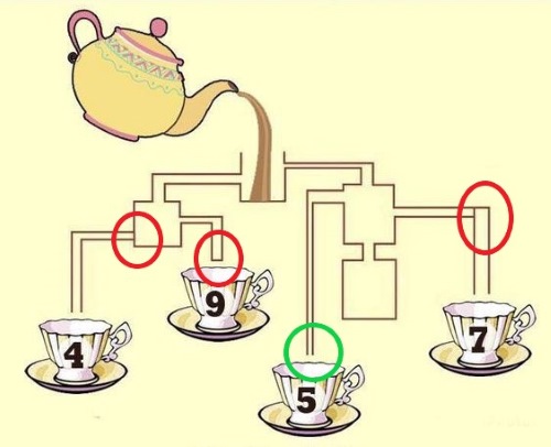 In this brain puzzle, your task was to examine the connections that allow the tea to flow into the cups. In this puzzle, we are assuming that none of the vessels will overflow.