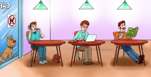 In the image above, your task is to figure out who the dog's owner is in the room. The puzzle depicts three individuals seated in a room where pets are not allowed. However, one of them has left their dog waiting patiently outside the room. The challenge is to identify which person the dog belongs to. Can you spot the dog's owner in just 7 seconds? Time is ticking—give it your best shot!