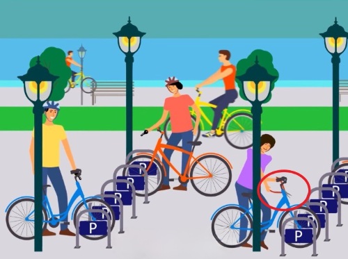Here’s your challenge: Look closely at the picture showing people taking their bicycles from a stand.