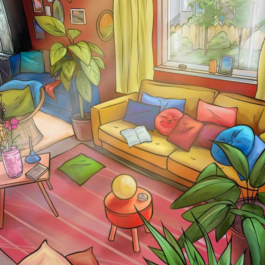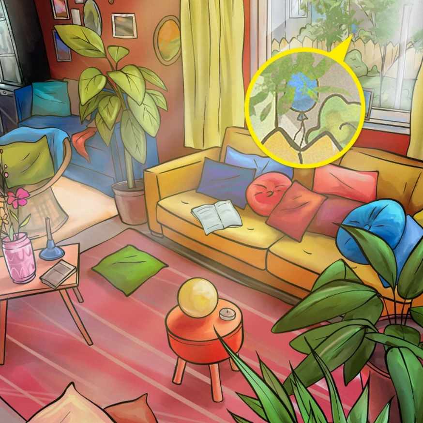 In the image above, you can see the inside of a living room. There is a couch opposite the big window that overlooks the garden, potted plants, settees, and a number of cushions in different shapes. There is also a balloon hidden somewhere in this picture. Can you find it? The challenge for you in this brain teaser puzzle is to find the balloon within the time limit. The time limit that we have set for this picture puzzle is 6 seconds. Will you succeed? Or will you fail?