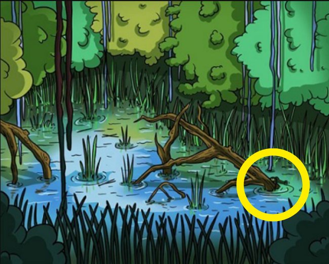 The image above shows a swamp-like water body. There are mangroves growing around it and there is a dangerous predator hiding in there, biding its time and waiting for the perfect moment to attack. The predator hiding in the murky waters is a crocodile, and it is your job to find it. You have only 5 seconds to spot the crocodile in the water. So, set your timers, and get started.