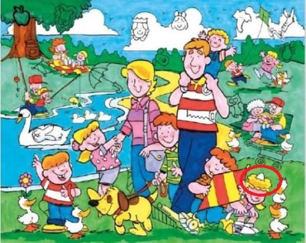 The image features a family enjoying near a lake. There are a number of things that can distract you from finding the nest, such as the background, and patterns.