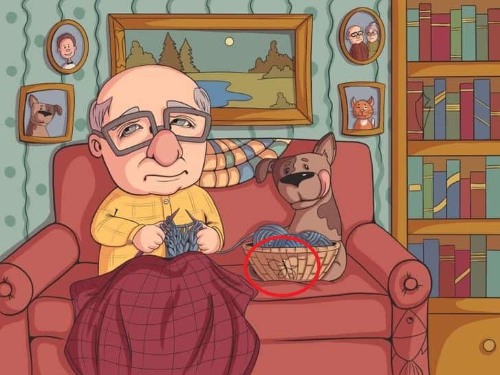 The image captures a peaceful scene of an elderly man lounging comfortably on a sofa, accompanied by his faithful dog in a cosy living room. Everything appears ordinary at first glance, but there’s a cleverly concealed butterfly hidden within the setting. Only those with keen eyesight and sharp focus will be able to find it in time!