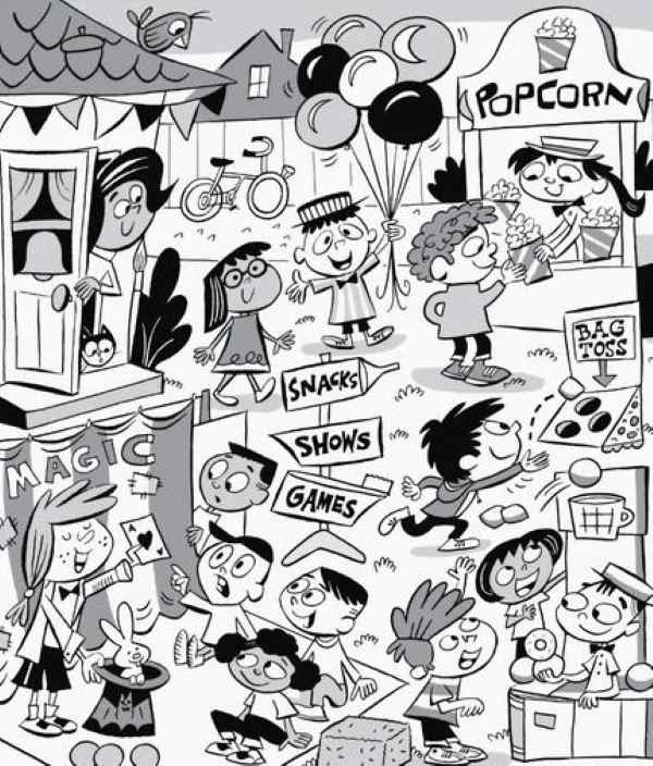 In the image below, you can see a backyard carnival where children are enjoying. However, there is something out of the blue that is hiding in this image.