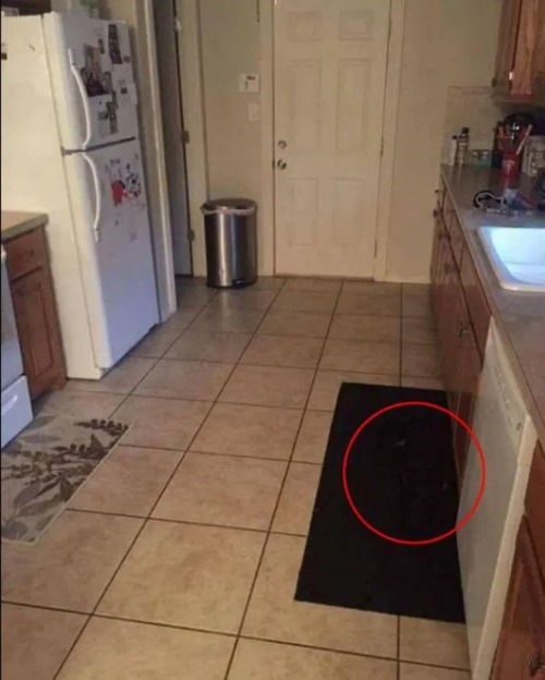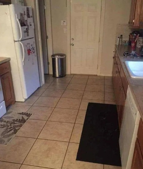 In the image below, you will witness a simple kitchen scene, but there is something hidden in this image. The owners of the home are looking for their dog, and it is hiding in the kitchen.