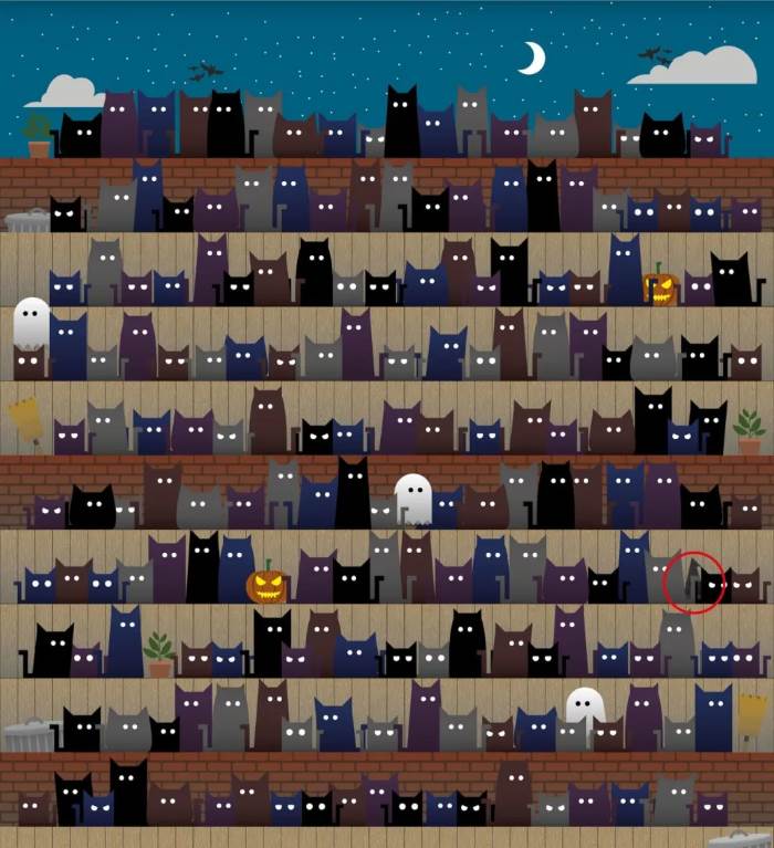 You have 17 seconds to spot the hidden witch hat among the spooky cats.