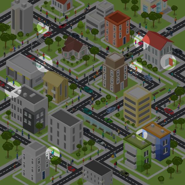The image features a busy city scene. There are a number of things that can distract you from finding the hazards, such as the closely knit buildings and people walking.