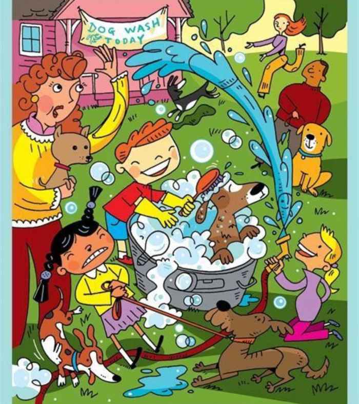 The above image shows a dog wash scenario which is very chaotic. The dogs are running and humans are chasing and washing them.