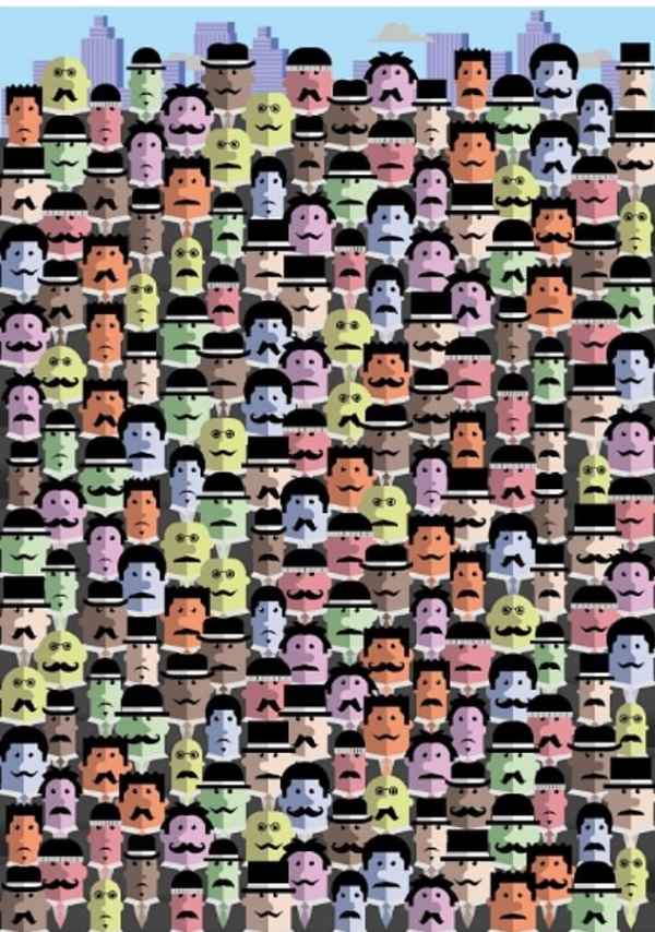 The image shows a group of men with a moustache but if you look closely, you can see that there is a man without one hidden among them.