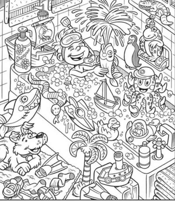 One popular seek-and-find puzzle is the "hidden objects" puzzle. In this puzzle, you are presented with a picture of a boy in a bathtub. In the scene, there are different objects hiding very discreetly.