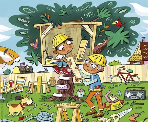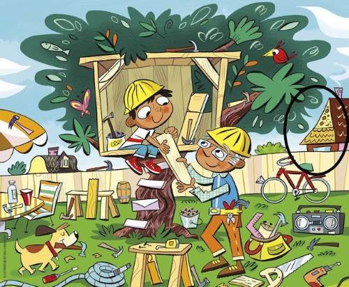 Take a closer look! This optical illusion challenges you to find the hidden pizza slice amidst the bustling scene of treehouse construction.