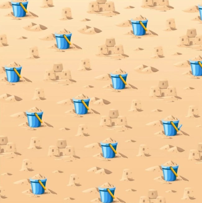 The image features sand on the beach filled with buckets. There are a number of things that can distract you from finding the shovel.
