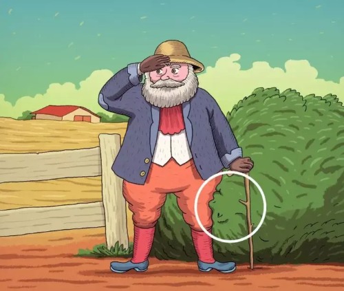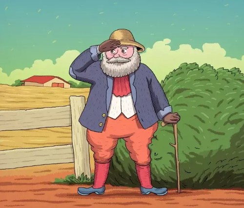 The image features an old man standing near a bush, but there is a twist.