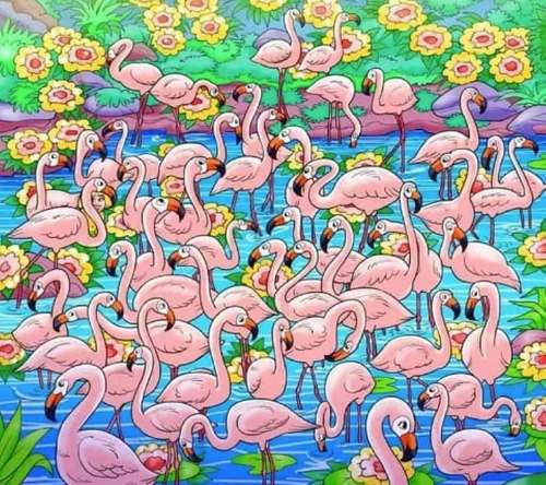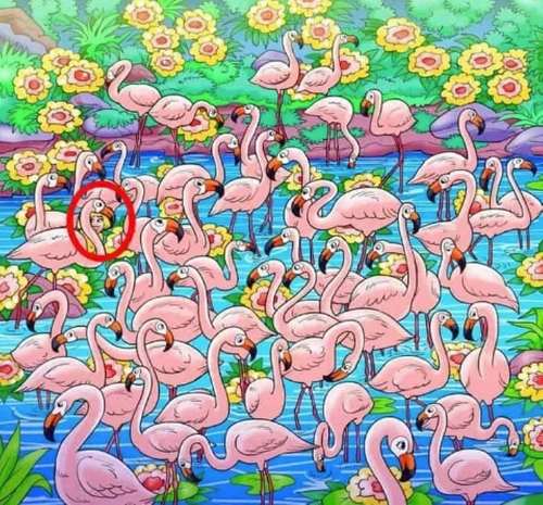 Take a close look at this image—it's filled with flamingos, creating a vibrant and busy scene. But hidden among them is a cleverly camouflaged girl, blending so seamlessly into the background that she’s nearly impossible to spot at first glance.