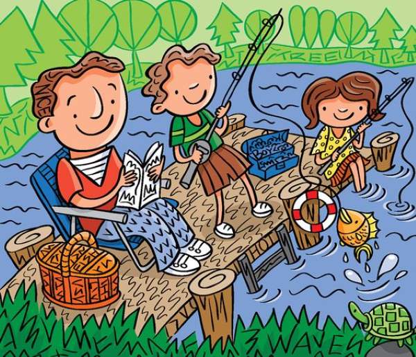 The above image shows a beautiful river scene with a family enjoying it. The background captures lush green trees and some plants.