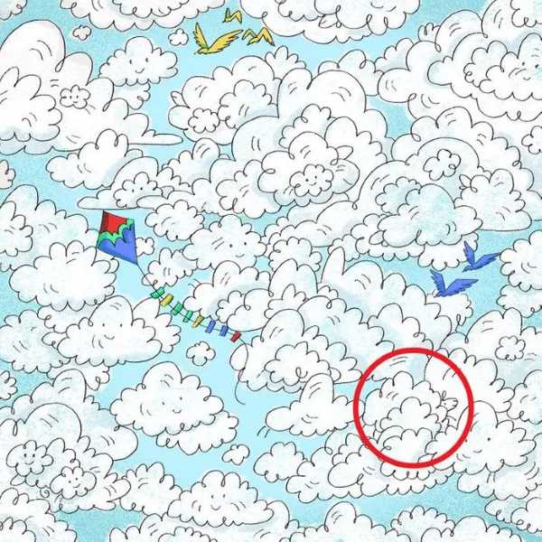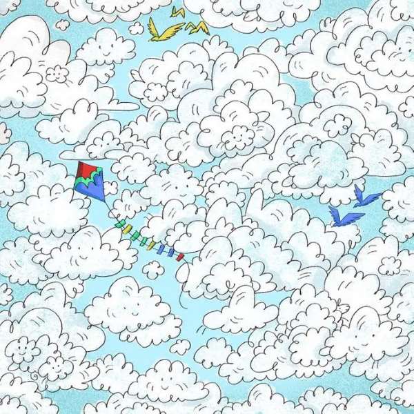 This optical illusion is a picture of clouds, a kite and birds, and if you look closely, you can see a sheep hiding among them.