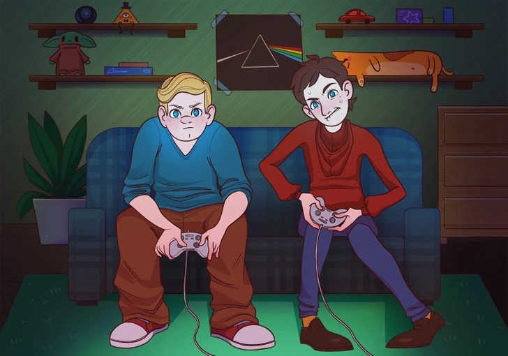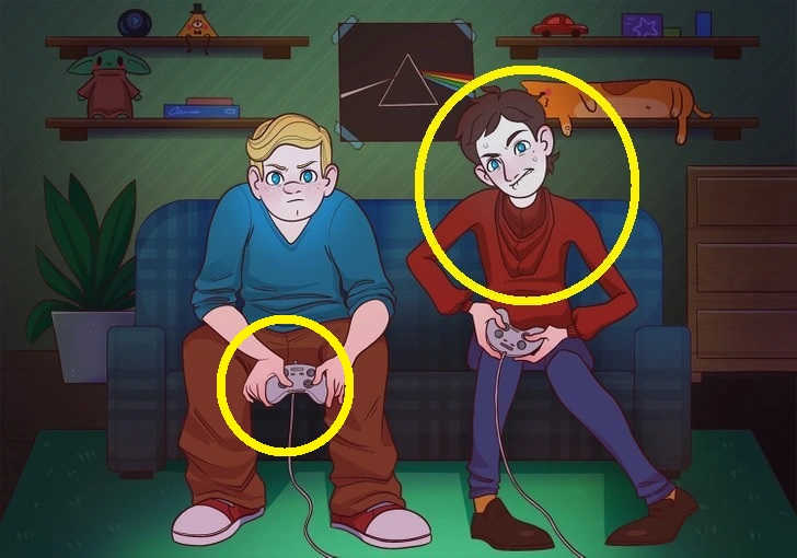 The mistake in the picture is that the boy on the right wore his hoodie the wrong way, and the guy on the left is holding the game controller incorrectly.