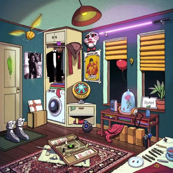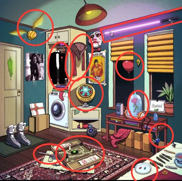 The above image shows a bedroom scene, with the room being a mess and covered with the movie items. The movie references that you have to find are: Iron Man, Harry Potter, IT, Titanic, Matrix, Jumanji, Men in Black, Pirates of the Caribbean, Star Wars, The Godfather, and Beauty and the Beast.