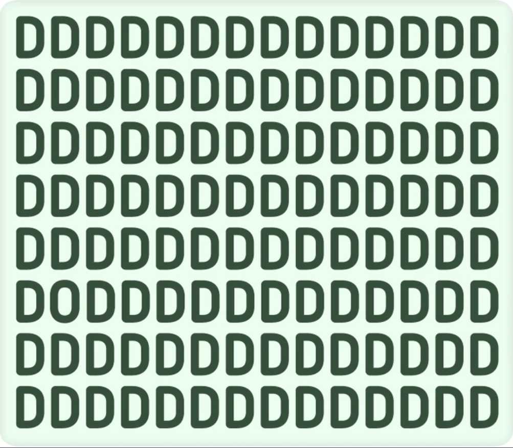 The image above shows the letter D distributed in 8 rows and 14 columns. Among the Ds is also hidden the letter O. Can you spot the O in the given time?