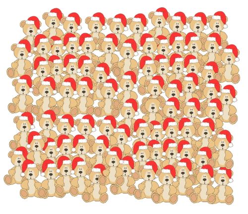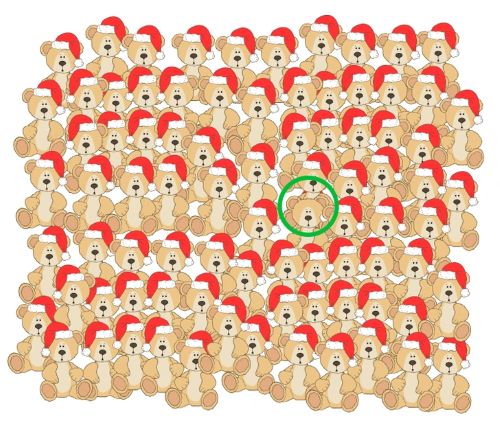 This optical illusion carries an image of teddy bears wearing Santa hat. Among these teddy bears, there is one imposter who is not wearing a hat.