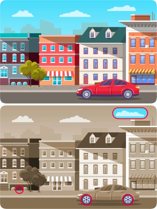 So, are you excited to know three differences? First, look at the right side of the sky; the first difference in both images is the different shape of the sky. The second difference is in car tyres. Both cars’ tyres have different shapes. The third one looks at the left side at the last building below the tree; the blue design is missing.