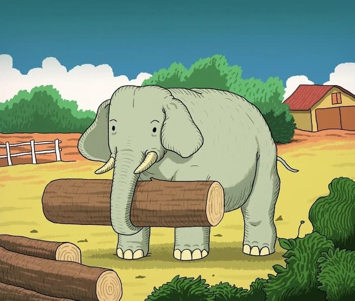 In the image shared above you can see a painting where an elephant can be seen carrying a log of wood. The surroundings in the picture is covered in grass and trees with the sky sporting pristine white clouds.