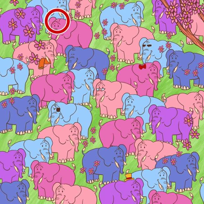 Enjoy this lovely illustration of an adorable herd of elephants in all different hues of blue, pink, and violet. In this brain teaser puzzle, you have to spot the heart hidden somewhere in the herd of elephants. Oh, and a plot twist!