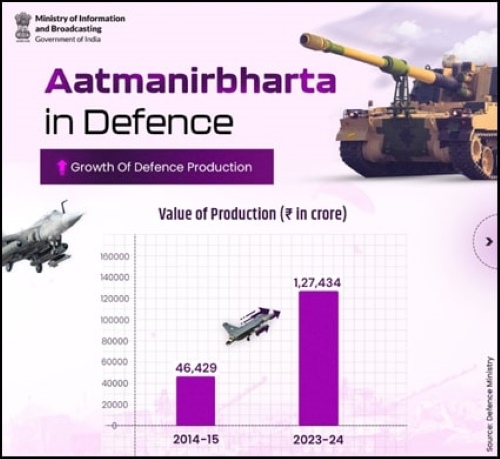 India's defence production reached ₹1.27 lakh crore in FY 2023-24, a 174% rise since 2014-15, driven by the Make in India initiative. Defence exports hit a record ₹21,083 crore, expanding 30 times in a decade, with exports to over 100 countries.