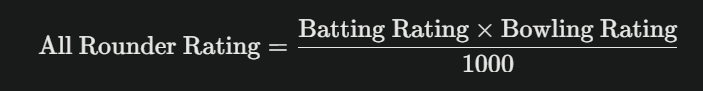 Additionally, all-rounder rankings are calculated by taking both batting and bowling performances into account. The formula used is: