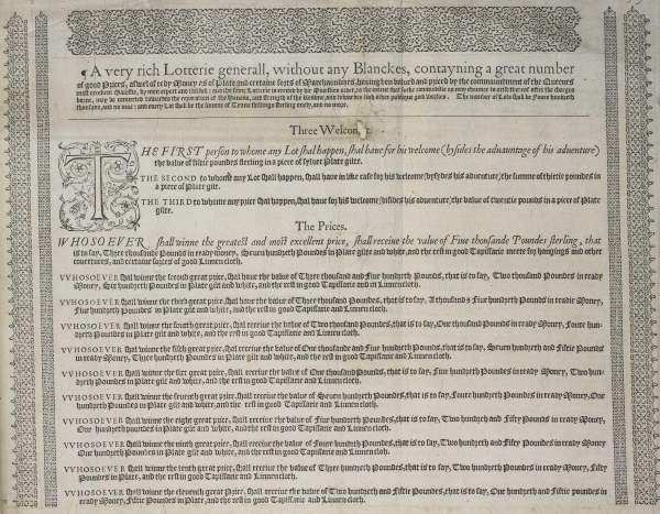 "The lottery was intended to raise money for the enormous costs of building ships and developing ports. Tickets cost ten shillings each – far too much for the ordinary citizen to afford. The first prize was an amazing £5000, which was paid partly in ‘ready money’ and partly in plate, tapestries and ‘good linen cloth’. To encourage as many people as possible to buy tickets, all ticket holders were promised freedom from arrest for all crimes other than murder, felonies, piracy or treason," it adds.