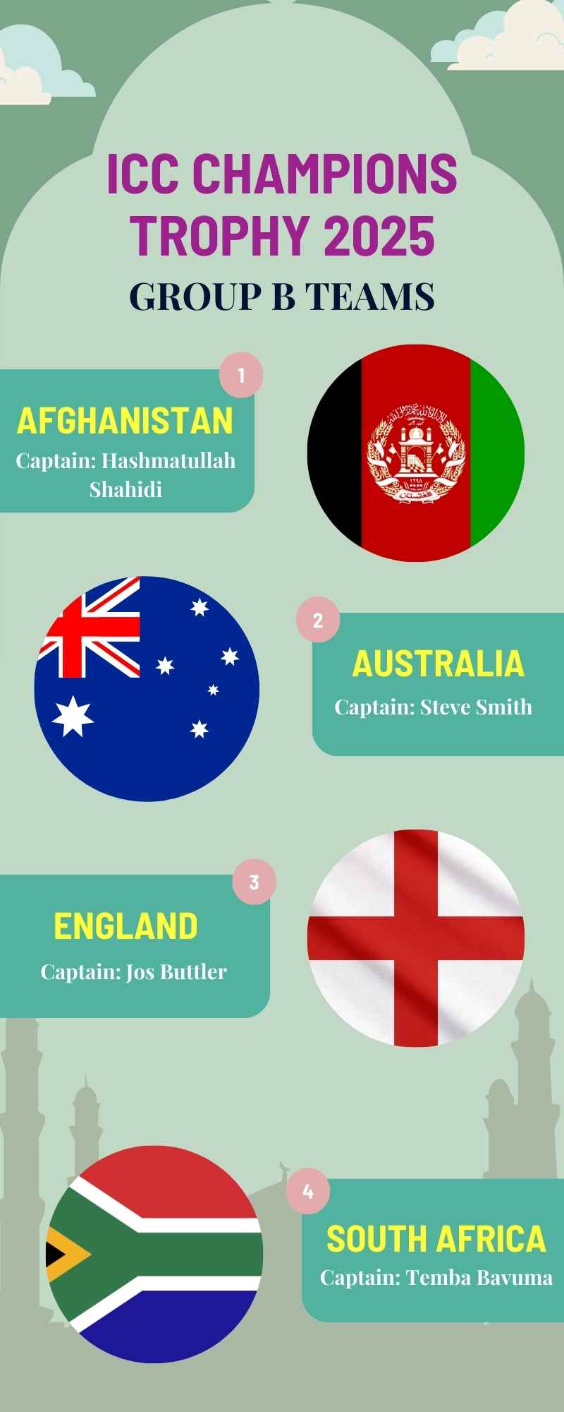 The 2025 ICC Champions Trophy will feature eight teams divided into two groups of four. The groupings are as follows: