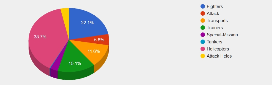 Their transport aircraft fleet numbers 270 (12.1%), with about 203 ready, placing them 4th in this category as well. They also have a significant number of training aircraft, with 351 (15.7%) in stock and an estimated 263 ready, ranking 6th.