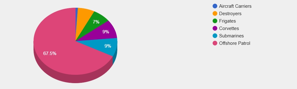 Their fleet includes 13 destroyers and 14 frigates, both ranking 4th. They also possess 18 corvettes, ranking 5th, and 18 submarines, placing them 7th.