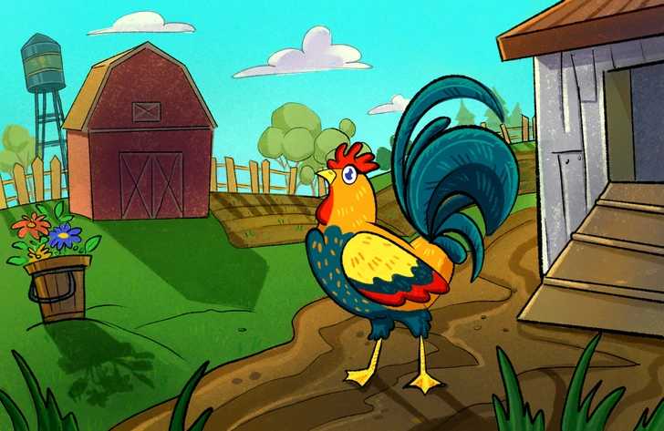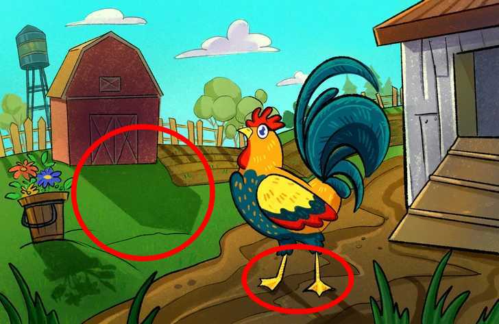 The mistakes in the picture are 1. The rooster has the legs of a duck, and 2. The shadow of the house is wrong.