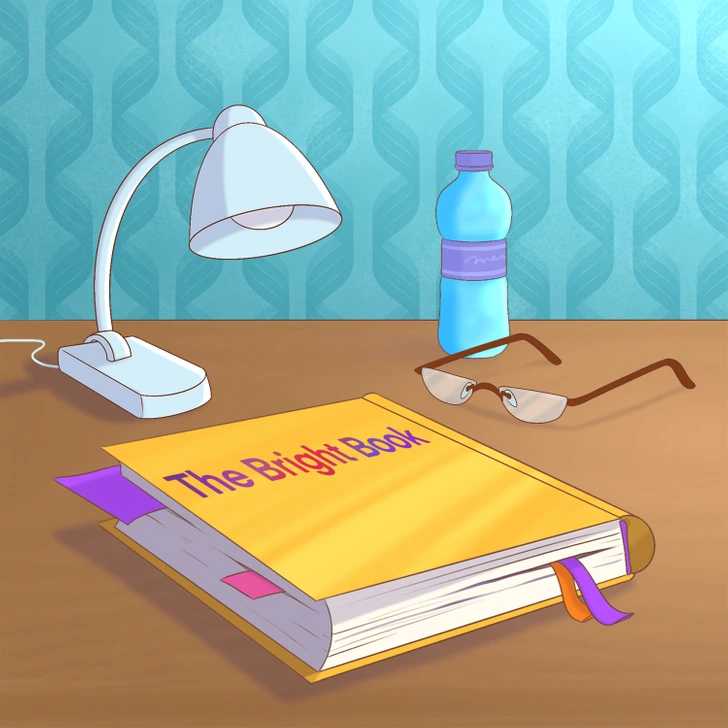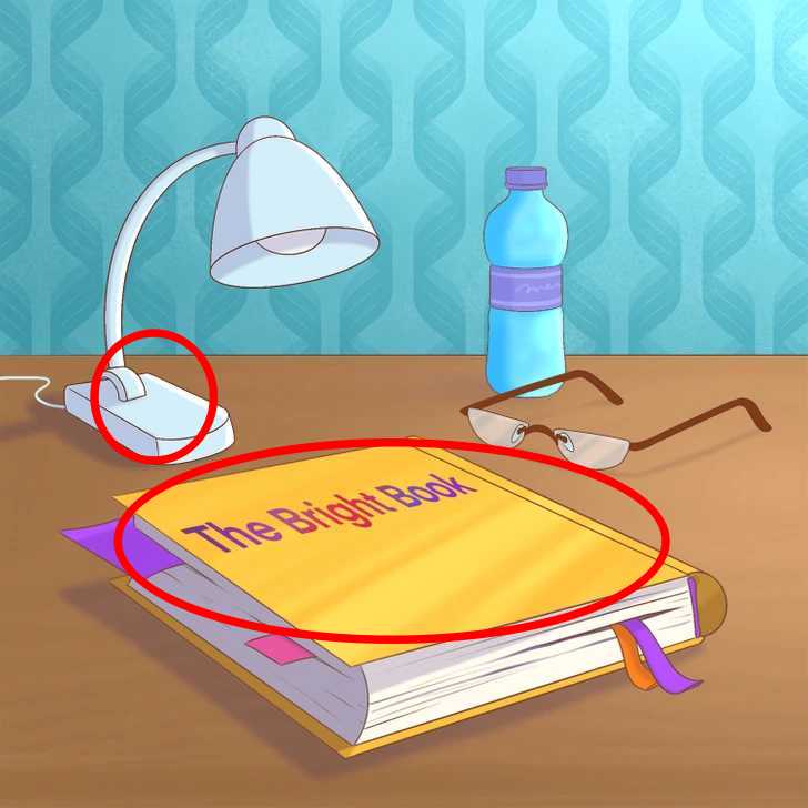 The mistakes in the picture are 1. There is no switch in the lamp, and 2. The book title and bookmarks are placed upside down.