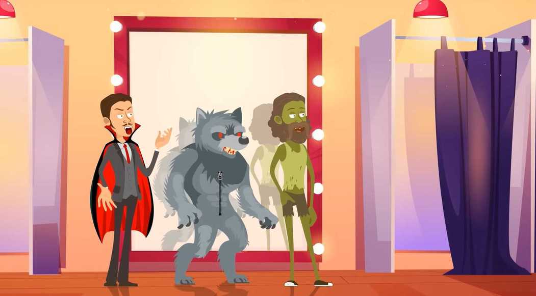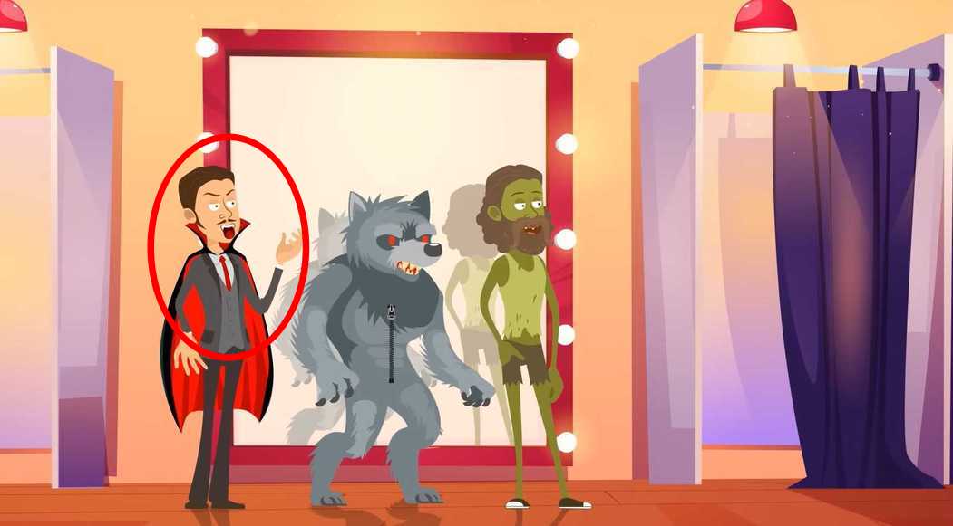 Humans will have their shadows reflected in the mirror; in this case, if you look carefully, the werewolf and zombie-dressed individuals' shadows are reflected in the mirror, while there is no shadow for the vampire.