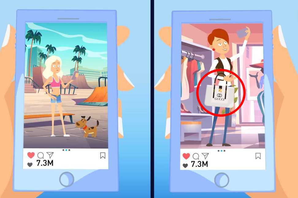 The fake influencer is the one carrying the designer bag; it is a fake one, as the bag has GUCCI written on it while the logo is that of CHANEL.