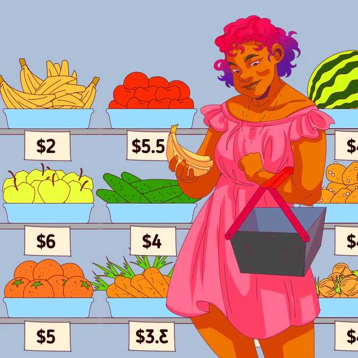 The picture shows a lady purchasing fruits and vegetables in a grocery store. At first glance, the picture looks pretty normal. But it’s not.
