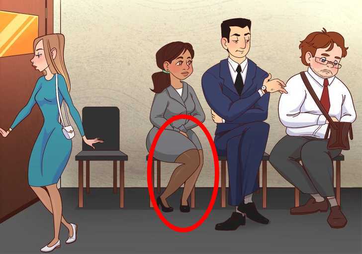 The mistake in the picture is that the second woman who is awaiting her turn for the interview came wearing two different coloured stockings.