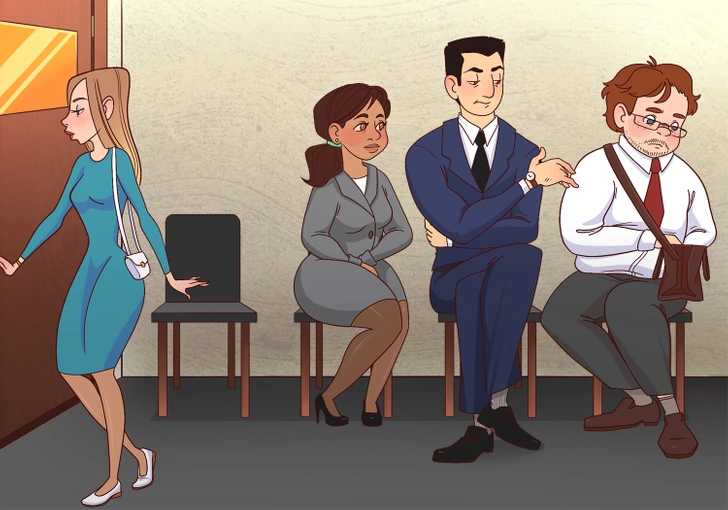 The picture shared above depicts an office interview scene where four people are seen. There are two men and two women. One of the women is entering the interview room, while the other 3 are waiting for their turn.