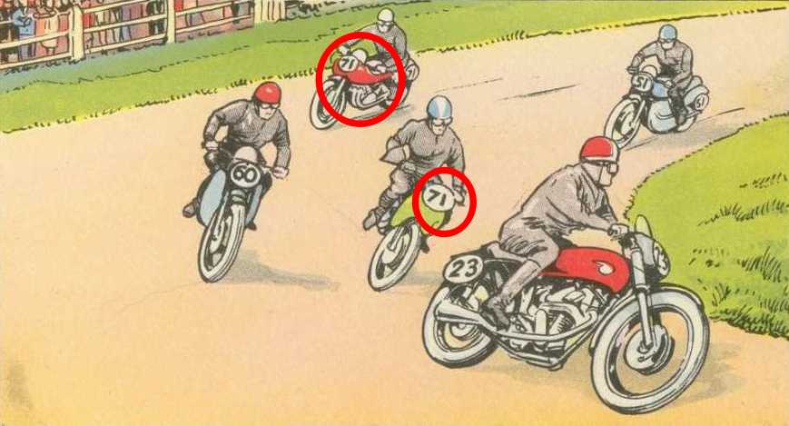 The mistake in the picture is that there are two motorbikes with the same number 71.