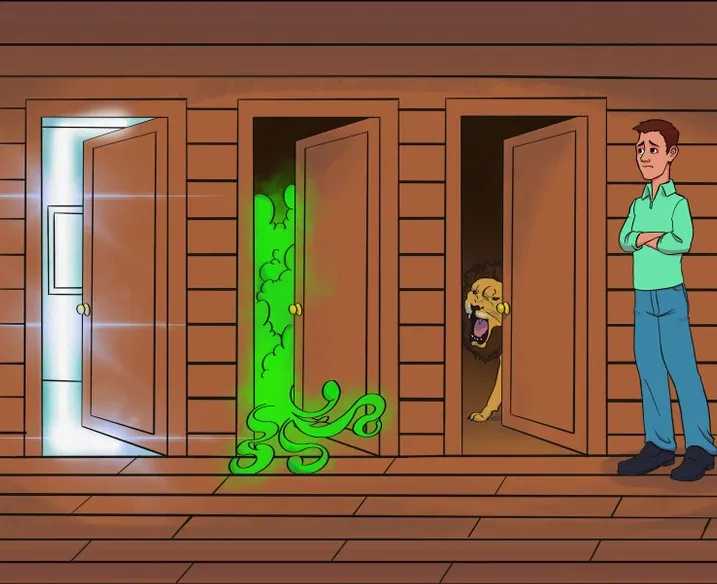 The image shared above depicts a guy who is trapped in the house, and there are three exits in front of him. Each of the doors has a potential danger, and he has to choose the safest door wisely.