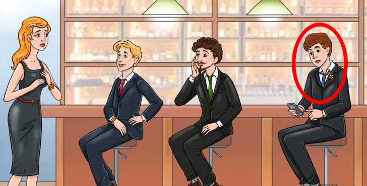 In this intriguing puzzle, a bar scene is depicted. Three young men wearing suits can be seen. One of them is the fiancé of the woman. Your task is to determine her fiancé by carefully examining the image.