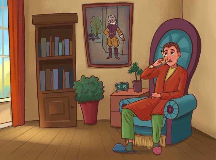 The image shared above depicts a person sitting on a sofa with a vintage painting in the background.