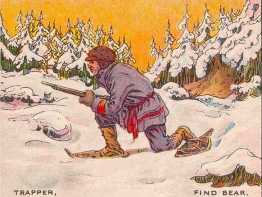 Take a close look at this optical illusion drawing and try to spot the large grizzly bear inside the forest. It may appear too tricky to find the bear, but if you tilt the image upside down it may help. The Bear is hiding between the trees on the right side covered with snow. The bear is actually upside down and disguised as a cliff face in the background of the hunter.