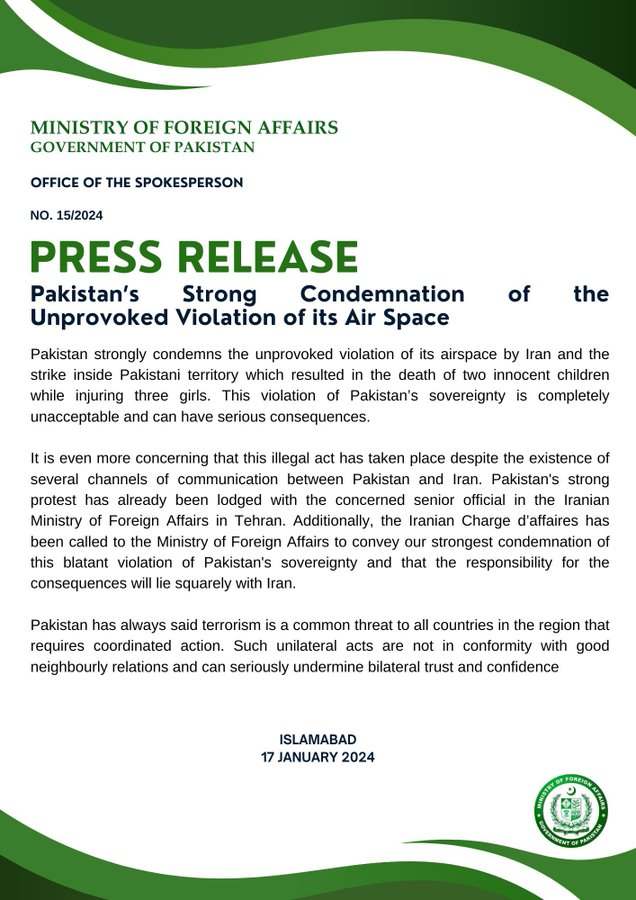 Pakistan has protested against Tehran, and the chief of the Iranian embassy in Islamabad has been summoned to the Ministry of Foreign Affairs. According to Pakistan's statement, the airstrike was “completely unacceptable” and "the responsibility for the consequences will lie squarely with Iran.”