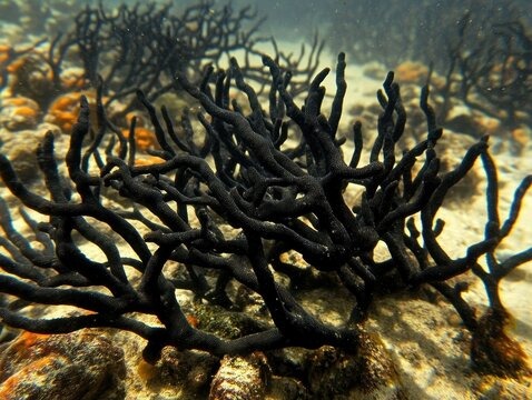 Black coral (Antipatharia) is a deep-sea coral known for its dark, tree-like skeleton. Unlike reef-building corals, it lacks symbiotic algae and thrives in deep, cold waters. Its flexible, black skeleton has been used for jewellery, but overharvesting has made some species endangered.